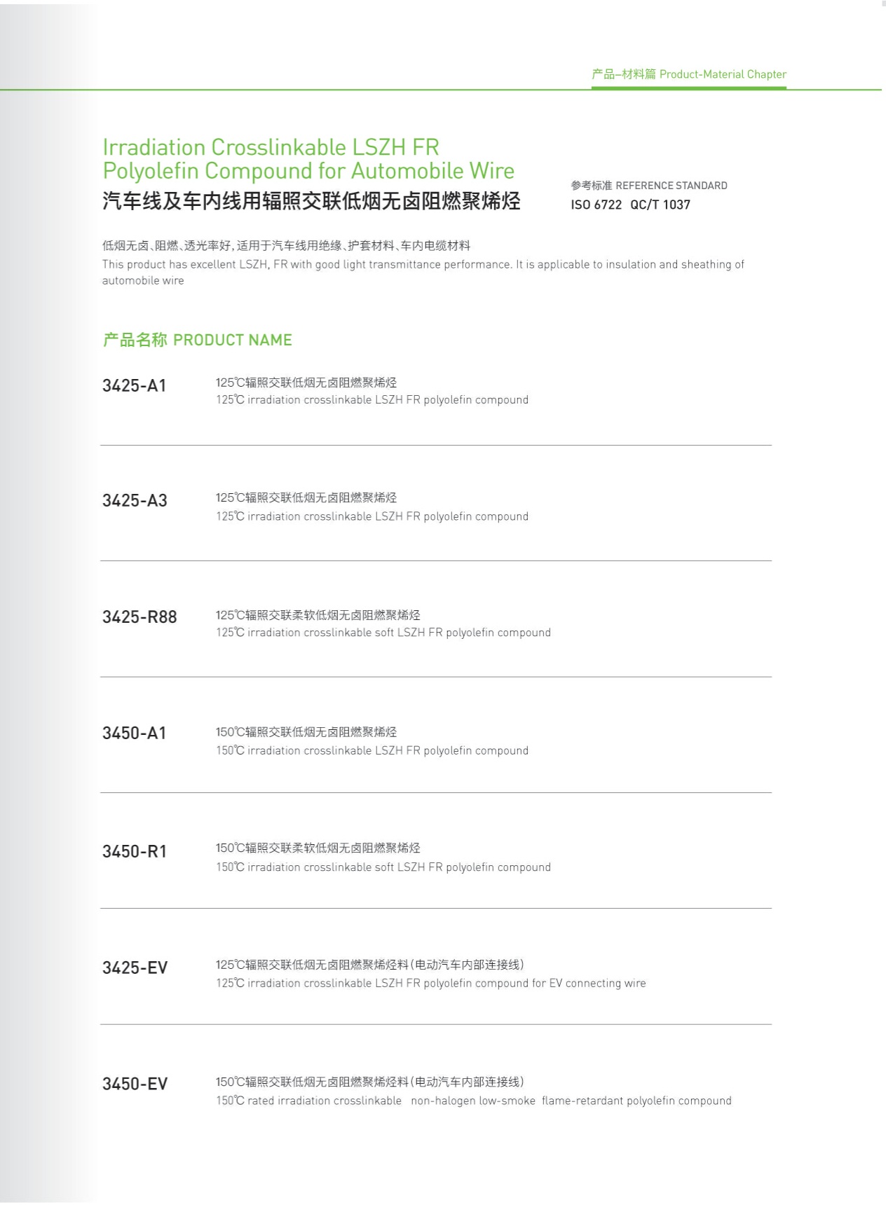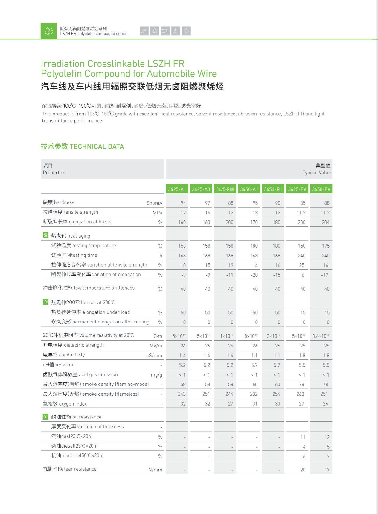 汽車線及車內(nèi)線用輻照交聯(lián)低煙無鹵阻燃聚烯烴